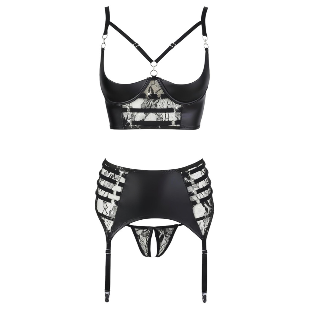 Fedezd fel a csábítás új dimenzióját az Abierta Fina exkluzív, szikrázó pántos-csipkés fehérnemű szettjével. Ez a mélyfekete összeállítás a kifinomult eleganciát ötvözi a merész, modern részletekkel, hogy te minden pillanatban magabiztosnak és ellenállhatatlannak Érezd magát.