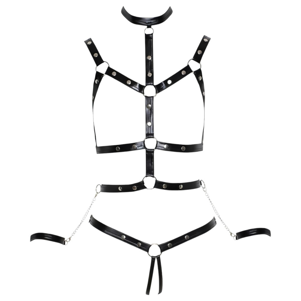 - Komplett szett: A csomag tartalmazza a testhámot és a hozzá illő csuklóbilincseket is a teljesebb élményért.