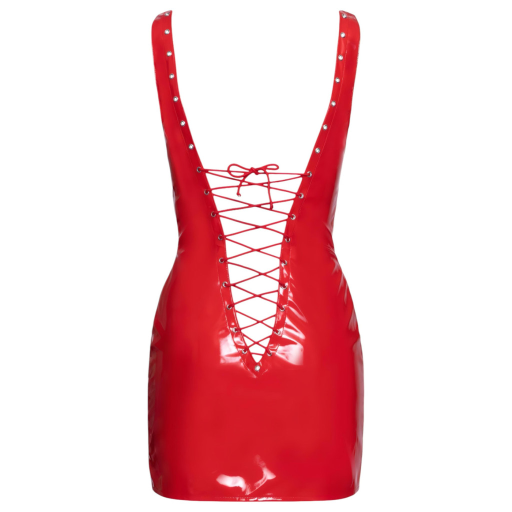 A ruha vibráló piros színe és magasfényű lakk anyaga azonnal magára vonzza a tekinteteket. Az elülső és oldalsó részeken található fűzős megoldás nemcsak esztétikailag izgalmas, hanem lehetővé teszi, hogy a ruha tökéletesen idomuljon az te alakjához, kiemelve a nőies vonalakat és biztosítva a csábító megjelenést.