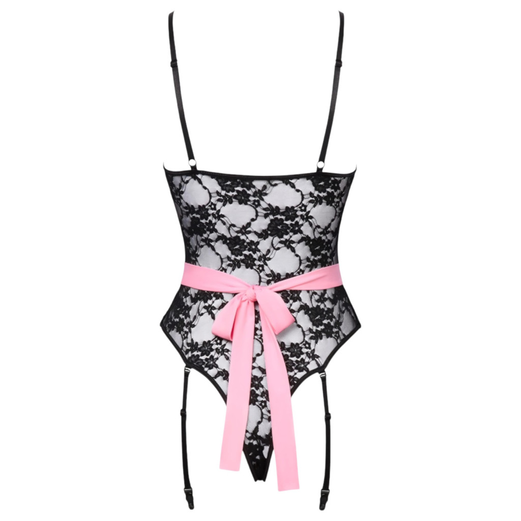 A jelmez finom, áttetsző mesh anyagból készült, amely sejtelmesen láttatni engedi a bőrt, miközben a fekete alapszínt játékos pink szegélyek és masnik teszik még nőiesebbé és flörtölősebbé. A szabásvonalat úgy alakították ki, hogy kiEmeld a női idomokat, miközben kényelmes viseletet biztosít a forró pillanatok alatt.