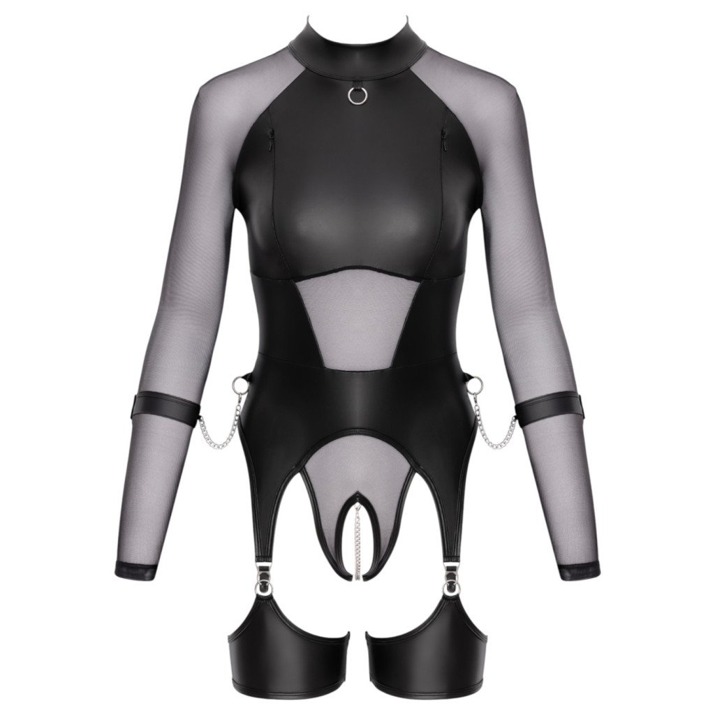 A felső lágy, áttetsző fekete anyagból készült, amely sejtelmesen engedi láttatni a bőrt, miközben titokzatos marad. A különleges kialakítás fénypontja a csuklóknál elhelyezett, beépített bilincs-rendszer. A fém láncok és a sötét szövet kontrasztja azonnal magára vonzza a tekintetet, és kijelöli a határokat a hálószobai kalandok során.