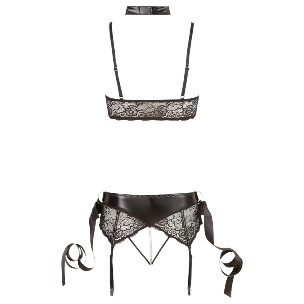 - Komplett összeállítás: Az 5 részes szett teljes harmóniát teremt a kiegészítők és a fehérnemű között.