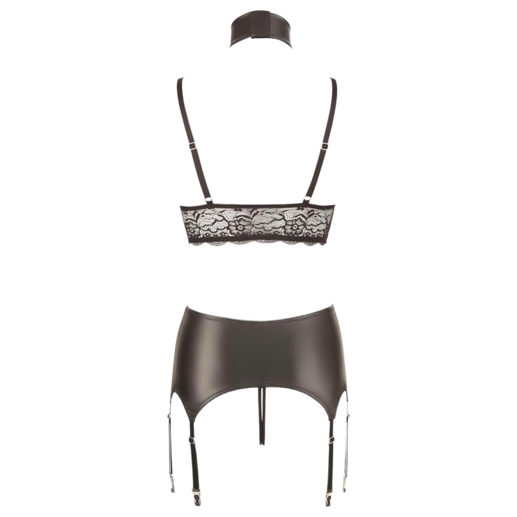 A dizájn központi eleme a matt csipke és a "wet look" hatású, fényes felületek kontrasztja, amely modern és domináns megjelenést kölcsönöz viselőjének. A 4 részes kialakítás lehetővé teszi a teljes körű stílusos megjelenést, legyen szó egy különleges estéről vagy az önkifejezés merészebb formáiról.