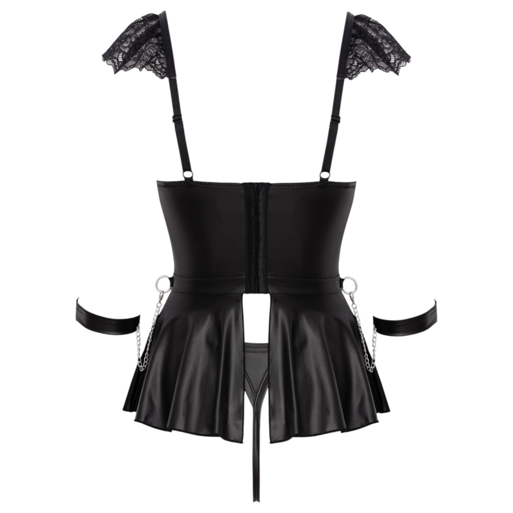 A ruha kiváló minőségű, áttetsző fekete csipkéből készült, amely lágyan öleli körbe az alakot, sejtelmesen láttatni engedve a bőrt. A modell igazi különlegessége a csuklóknál található, stílusos bilincsekben rejlik, amelyek nemcsak látványos kiegészítők, hanem izgalmas, játékos dominanciát csempésznek a hálószobába.