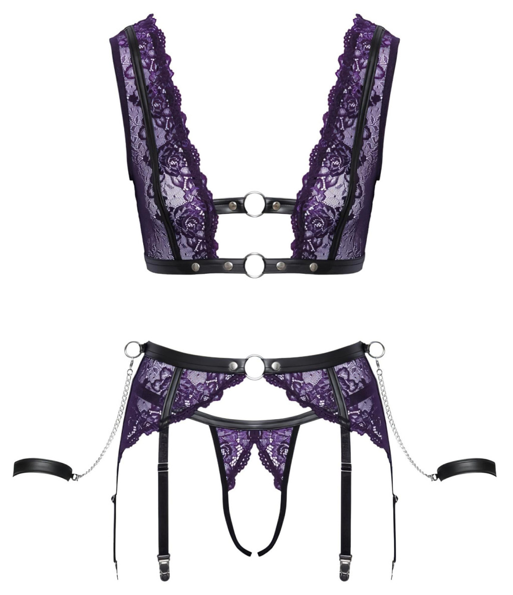 Fedezd fel az érzékiség és a játékos dominancia világát a Cottelli Bondage exkluzív fehérnemű szettjével. Ez a különleges, fekete és lila színekben pompázó összeállítás a csábítás legmagasabb fokát képviseli, ötvözve a klasszikus eleganciát az izgalmas bondage stílusjegyekkel.