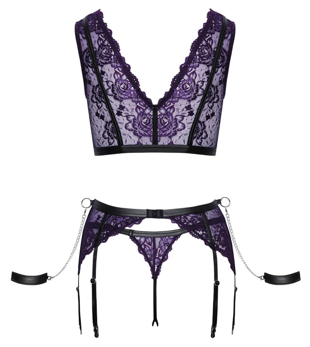 A szett nem csupán egy fehérnemű, hanem egy komplett élmény. A finom, mégis strapabíró anyagok tökéletesen simulnak a testre, kiemelve a női idomokat, miközben a kontrasztos lila részletek vonzzák a tekintetet. A csomag részét képező beépített karbilincsek egy újabb réteget adnak az intim pillanatokhoz, lehetővé téve a gyengéd korlátozást és a hatalmi játékok felfedezését.
