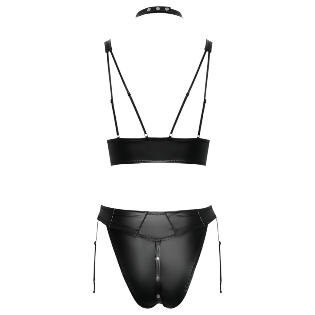 A melltartó magasfényű, lakk hatású anyaga mágnesként vonzza a tekintetet, miközben selymesen simul a bőrhöz. A fekete szín mélysége és a fényes felület játéka titokzatosságot és vadságot kölcsönöz viselőjének. A szett különlegessége a hozzá integrált csuklópántokban rejlik, amelyek lánccal kapcsolódnak a melltartóhoz, így azonnal készen áll a játékos korlátozásra és a szenvedélyes átadásra.