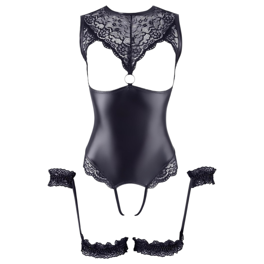 A body különlegessége a magasfényű "wet look" anyagban rejlik, amely tökéletesen követi a test vonalait, és minden mozdulatnál vonzza a tekintetet. A merész, nyitott mell- és ülep rész semmit sem bíz a képzeletre, így ideális választás az intim pillanatok felforrósításához.
