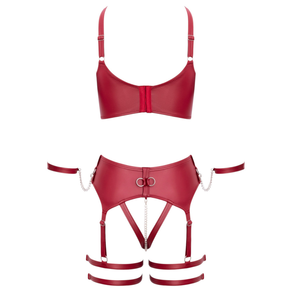 A melltartó különlegessége a keresztpántos kialakítás, amely optikailag formálja a dekoltázst, miközben a bondage-stílusú részletek izgalmas és modern esztétikát kölcsönöznek viselőjének. A tüzes piros szín a szenvedélyt szimbolizálja, így ez a szett tökéletes választás különleges alkalmakra, ahol a csábítás a cél.