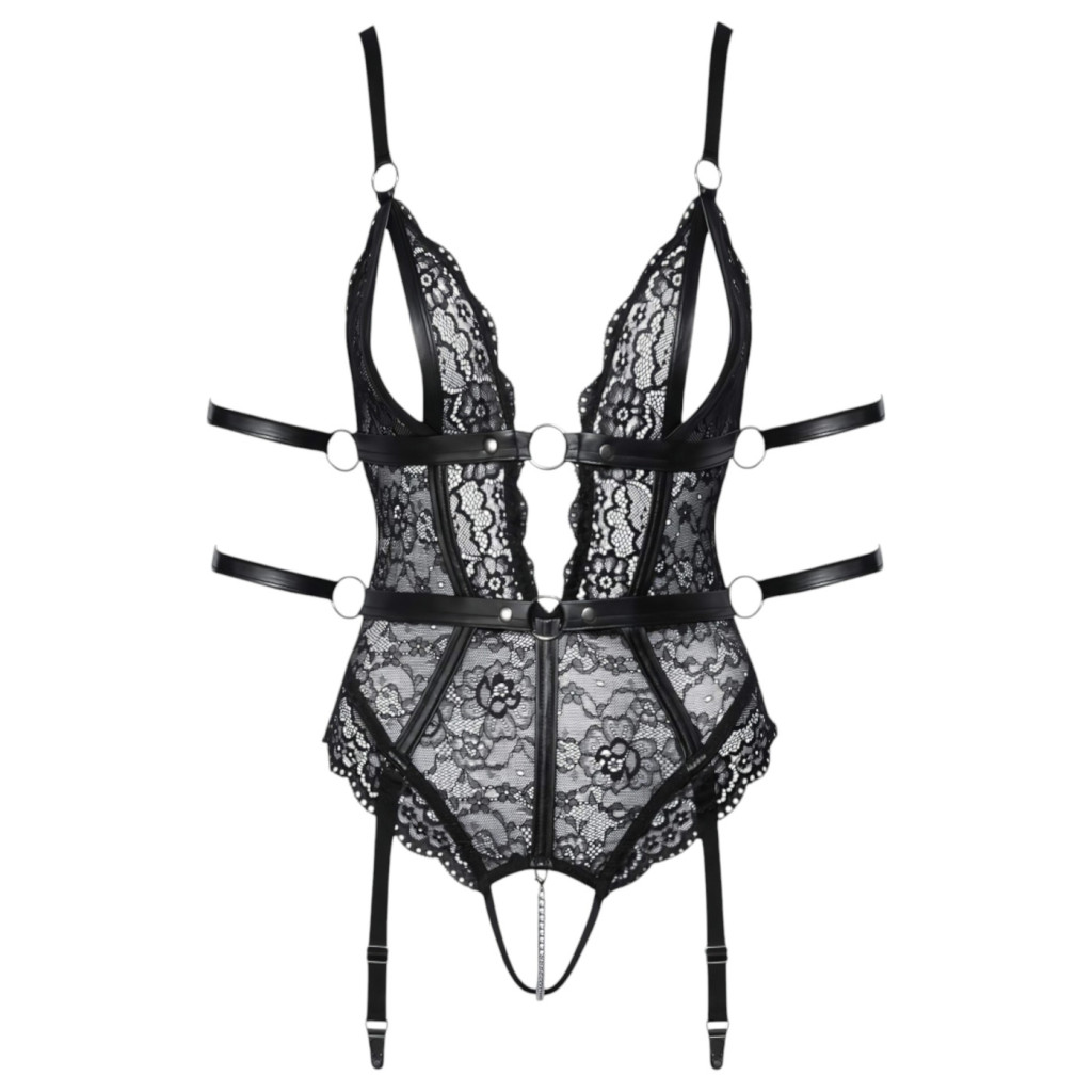 Engedd szabadjára vágyait a Cottelli Bondage kollekciójának egyik legizgalmasabb darabjával. Ez a mélyfekete, áttetsző csipkéből készült body a klasszikus nőiességet ötvözi a modern, provokatív bondage stílussal, így garantáltan felejthetetlenné teszi a hálószobában töltött pillanatokat.
