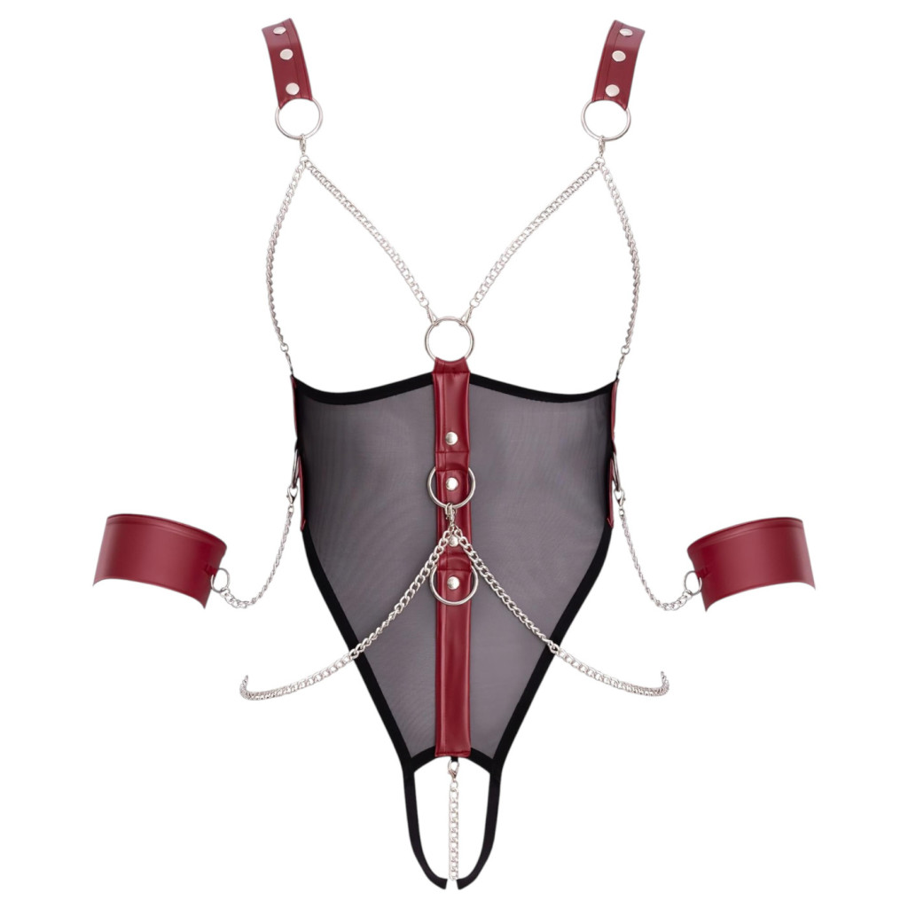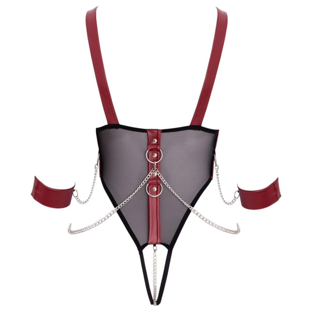 A body különlegessége a stratégiailag elhelyezett, rugalmas pántrendszer, amely kiemeli a test vonalait, miközben a nyitott (ouvert) kialakítás gondoskodik a pikáns és merész hangulatról. Az összképet egy stílusos, fémes csillogású lánc teszi teljessé, amely extra dominanciát és luxusérzetet kölcsönöz a szettnek.