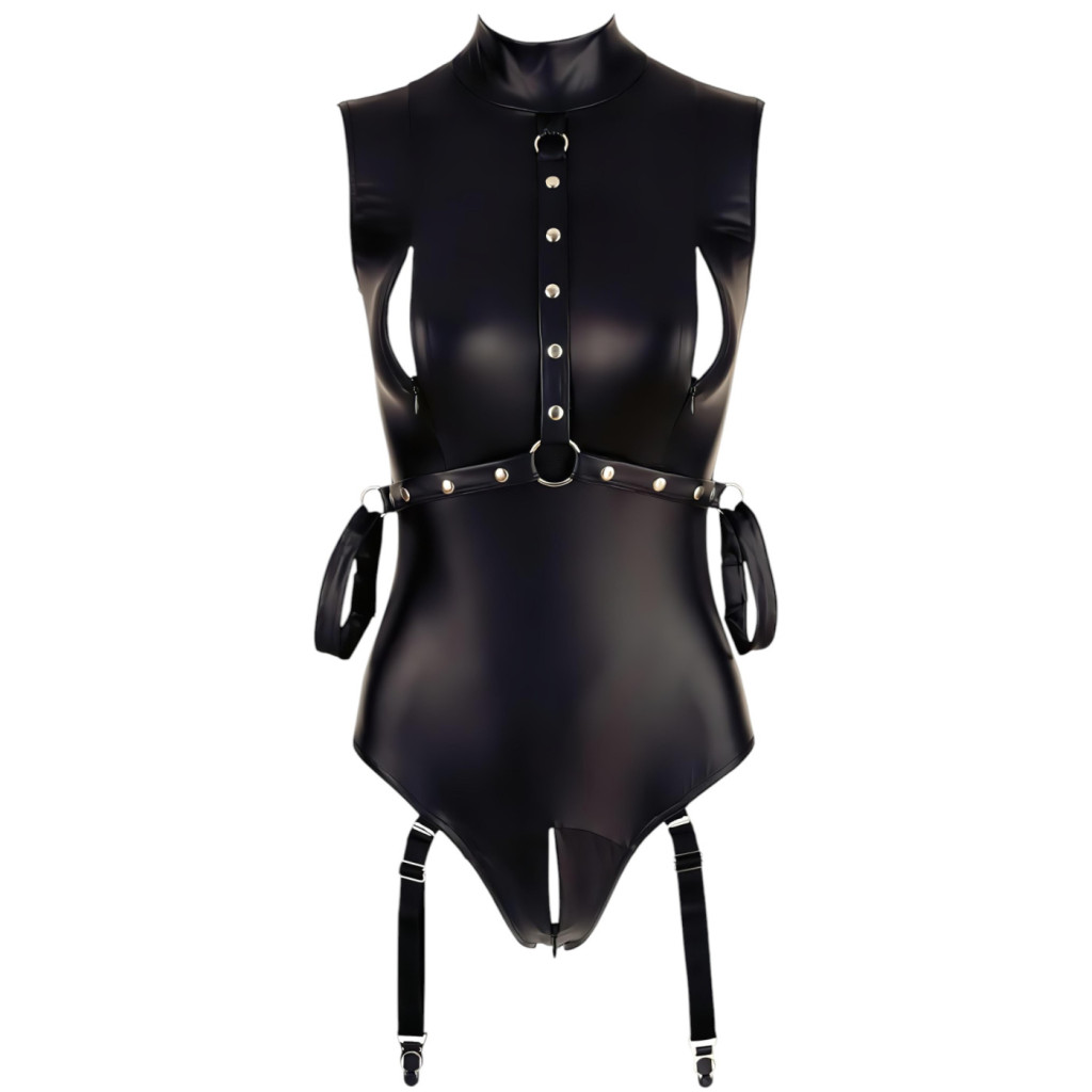 A szett legizgalmasabb eleme a beépített karbilincs rendszer. A body oldalán található fémgyűrűkhöz csatlakozó karkötők segítségével a karok a test mellé rögzíthetők, így teremtve meg a bondage élmény privát, mégis esztétikus formáját. A kiegészítők stílusosak és tartósak, tökéletes összhangban a body fekete fényével.