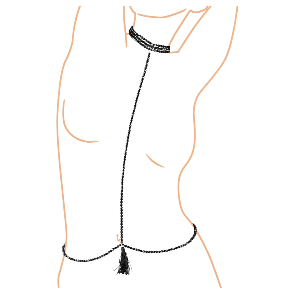 A testhám kialakítása egyszerre modern és időtlen: a nyakpántos megoldás stabil tartást ad, miközben a finom gyöngysorok lágyan simulnak a bőrre, kiemelve a test természetes vonalait. Viselheti önmagában, a hálószobai izgalmak fokozására, de akár egy mélyen dekoltált ruha vagy blúz alá rejtve is, mint egy különleges ékszert.