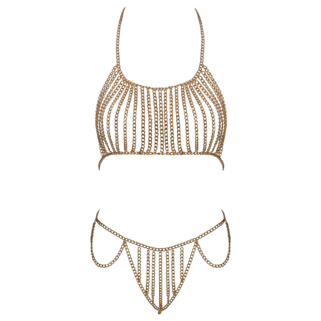 A finom kidolgozású, ragyogó arany tónusú láncok lágyan követik a test vonalait, különleges és luxus érzetet kölcsönözve viselőjének. A minimalista, mégis rendkívül mutatós dizájn lehetővé teszi, hogy a testdíszt kedvenc fehérnemű szettjével kombinálva, vagy akár önmagában, a hálószobai pillanatok megfűszerezésére viselje.