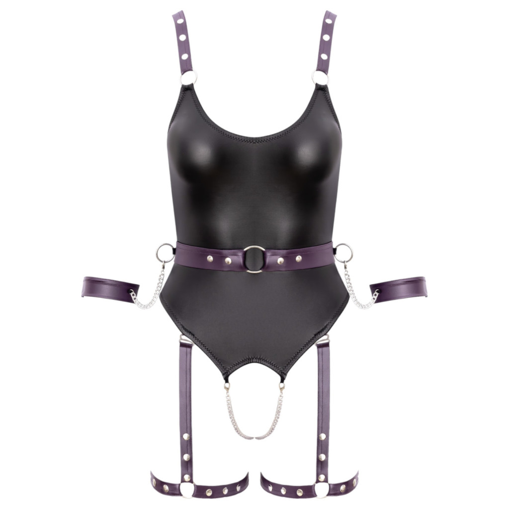 A body különlegessége a teljesen nyitott kialakítás, amely szabadon Hagyd a melleket és az ágyéki részt, így semmi sem állhat az élvezetek útjába. A stratégiailag elhelyezett pántok kiemelik a test vonalait, miközben magabiztosságot kölcsönöznek viselőjének. Az öltözék fénypontja a csuklóknál található, beépített fém bilincs, amely lánccal van összekötve, lehetővé téve a karok stílusos és izgalmas rögzítését.
