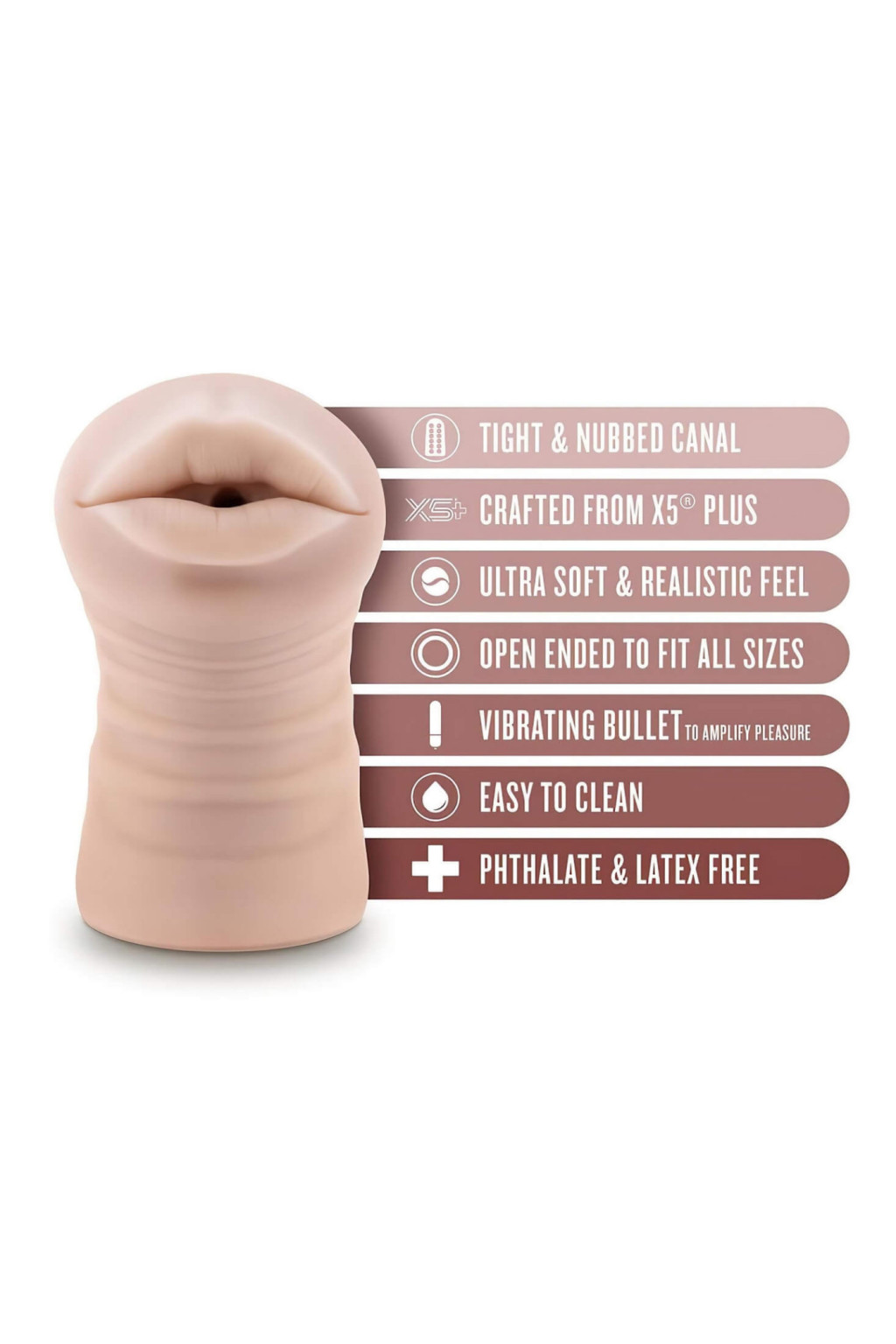 A Nicole modellt úgy tervezték, hogy minden érzékszervére hasson. A natúr színű, rendkívül puha és rugalmas anyag a valódi bőr érintését idézi, míg a belső textúra minden mozdulatnál intenzív stimulációt biztosít. A beépített vibrációs motor gondoskodik arról, hogy az élmény ne csak élethű, hanem bizsergetően izgalmas is legyen.