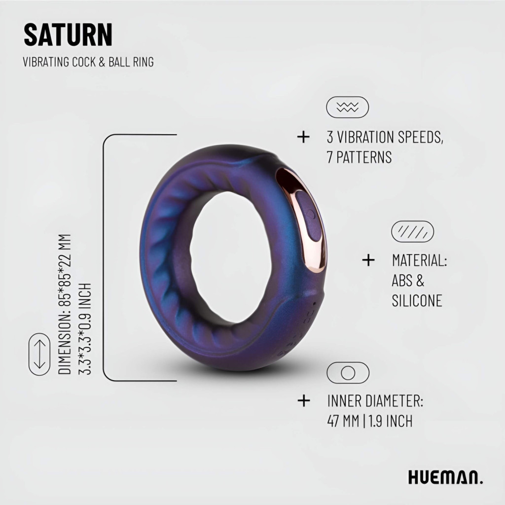 A Hueman Saturn egy prémium kategóriás, újratölthető vibrációs péniszgyűrű, amelyet kifejezetten a páros élvezetek maximalizálására terveztek. Ez az elegáns, lila színű kiegészítő nem csupán a férfi teljesítményét támogatja az erekció fenntartásával, hanem erőteljes rezgéseivel közvetlenül kényezteti a partnert is, felejthetetlen közös pillanatokat szerezve.