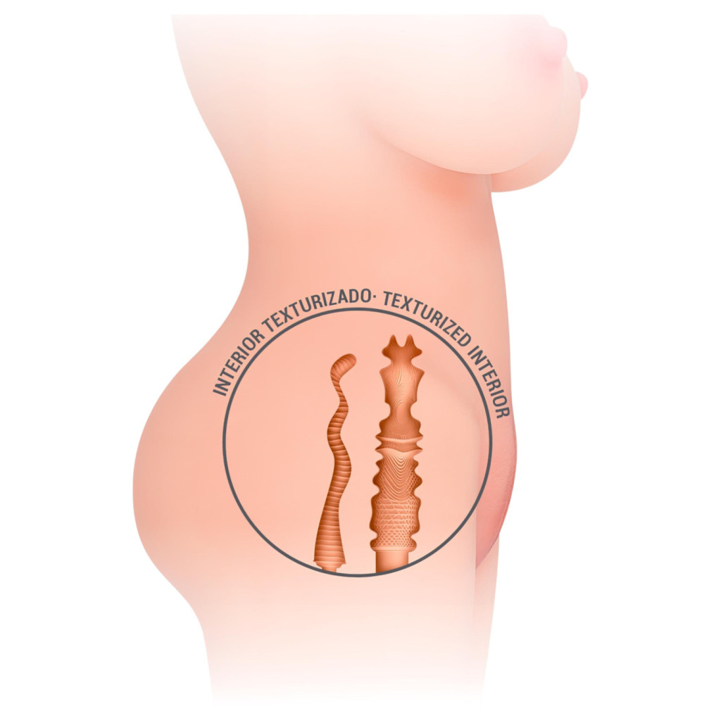 A Jesse torzó különlegessége a dupla kényeztetésben rejlik: két különböző anatómiai nyílással (vaginális és anális) rendelkezik, amelyek belső szerkezete eltérő textúrával lett kialakítva. A szűk, bordázott és stimuláló dudorokkal teli belső csatornák minden mozdulatnál fokozzák az élvezetet, miközben a vákuumhatás gondoskodik a teljes kielégülésről.
