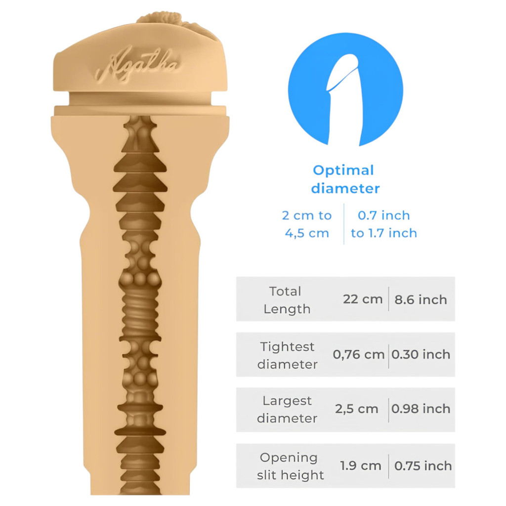 Az Agatha Vega belső kialakítása gondosan tervezett barázdákkal és stimuláló pontokkal rendelkezik, amelyek intenzív súrlódást és felejthetetlen élményt garantálnak. A termék egyik legnagyobb előnye a PowerBlow kompatibilitás, így zökkenőmentesen használhatod a Kiiroo automata készülékével a teljesen kéz nélküli, gépi stimulációért, de önmagában, manuális maszturbátorként is tökéletesen megállja a helyét.