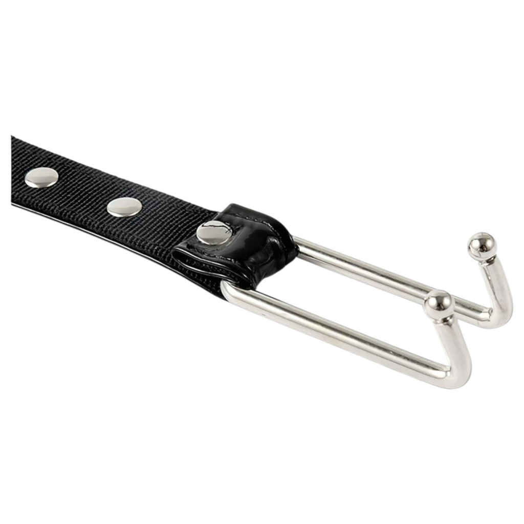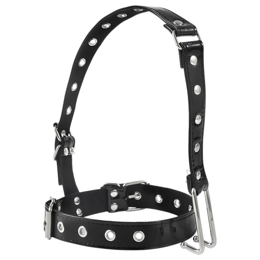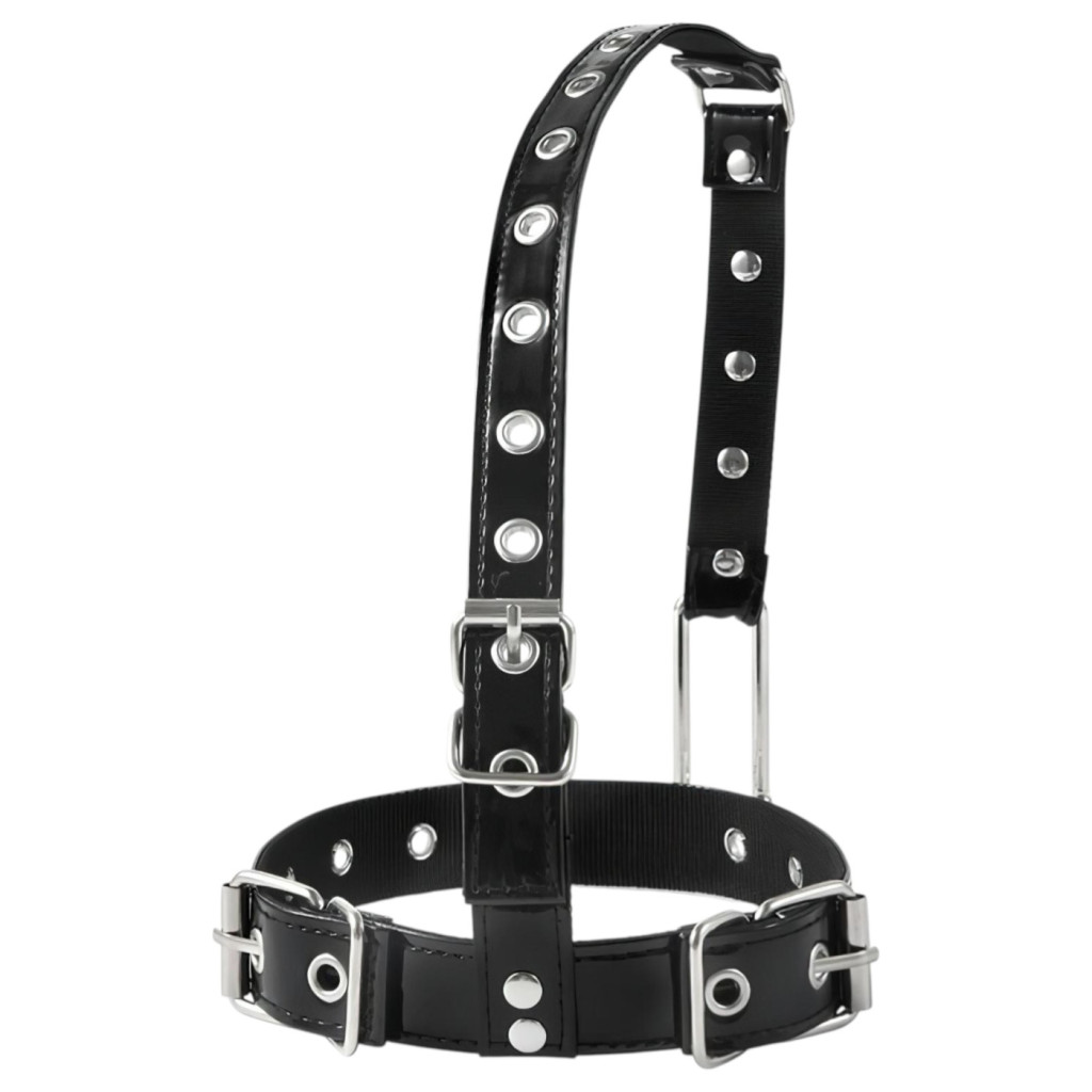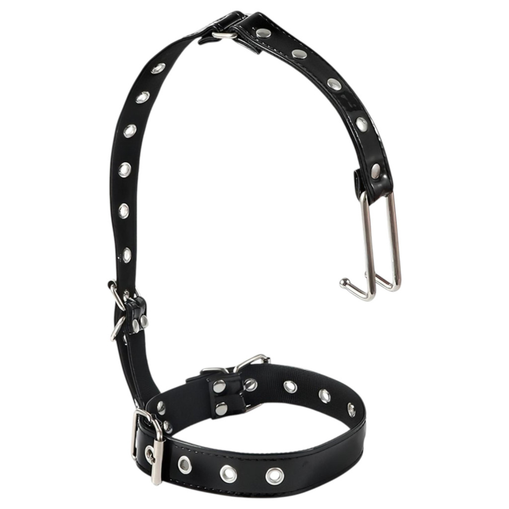A termék lelke a stabil, fémből készült orrkampó, amely finoman, mégis határozottan kényszeríti a viselőjét a fej megemelésére, ezzel kiszolgáltatott és elegáns tartást kölcsönözve. A nyakörv belső kialakítása kényelmes, így hosszabb ideig tartó használat során is viselhető marad, miközben a külső fekete borítás tekintélyt parancsoló megjelenést biztosít.