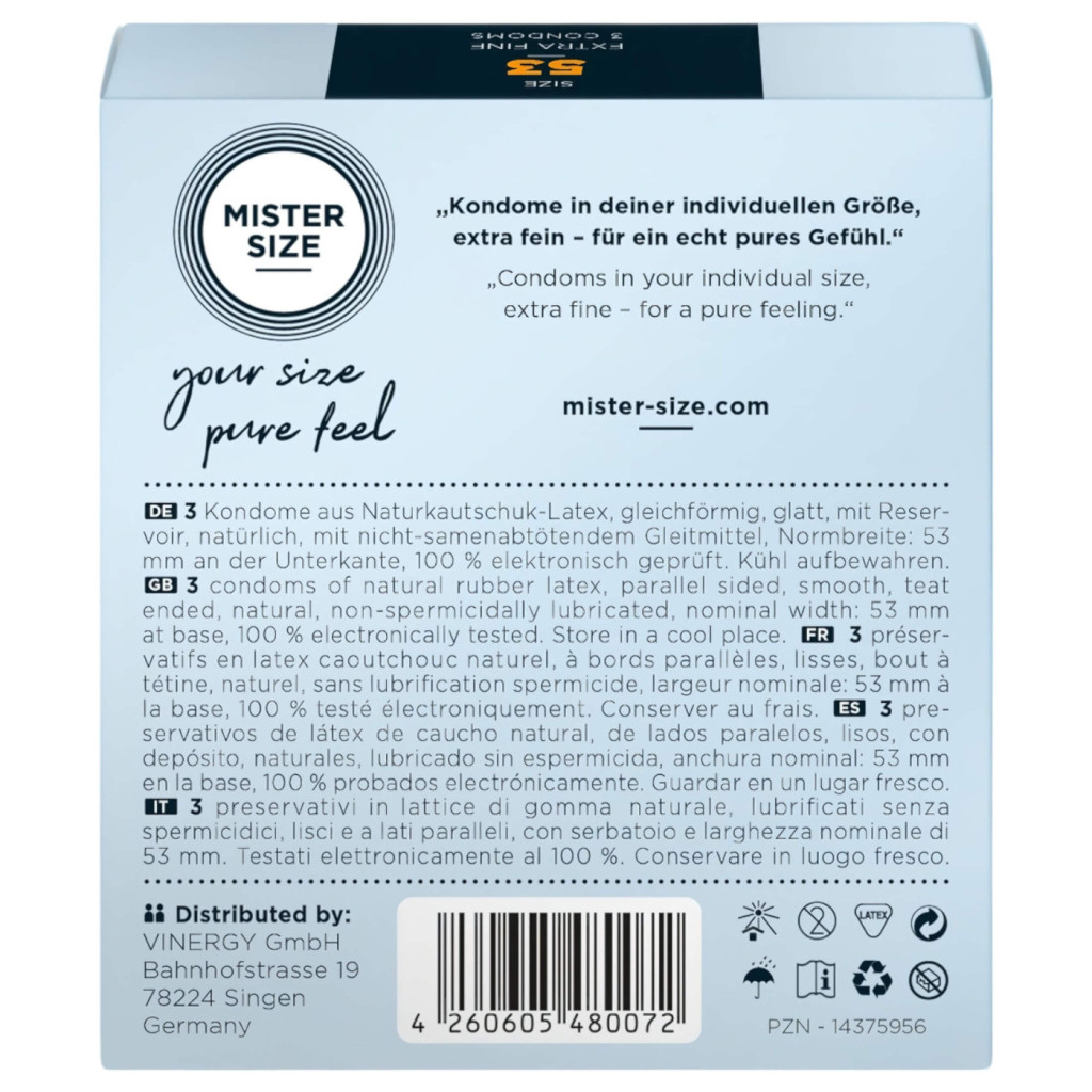 Ez a prémium minőségű, ultra vékony fallal rendelkező óvszer lehetővé teszi, hogy minden érintést intenzíven Érezdn, miközben teljes biztonságban tudhatja magát és partnerét. A Mister Size célja, hogy az óvszer ne gát, hanem egyfajta "második bőr" legyen az együttlétek során.