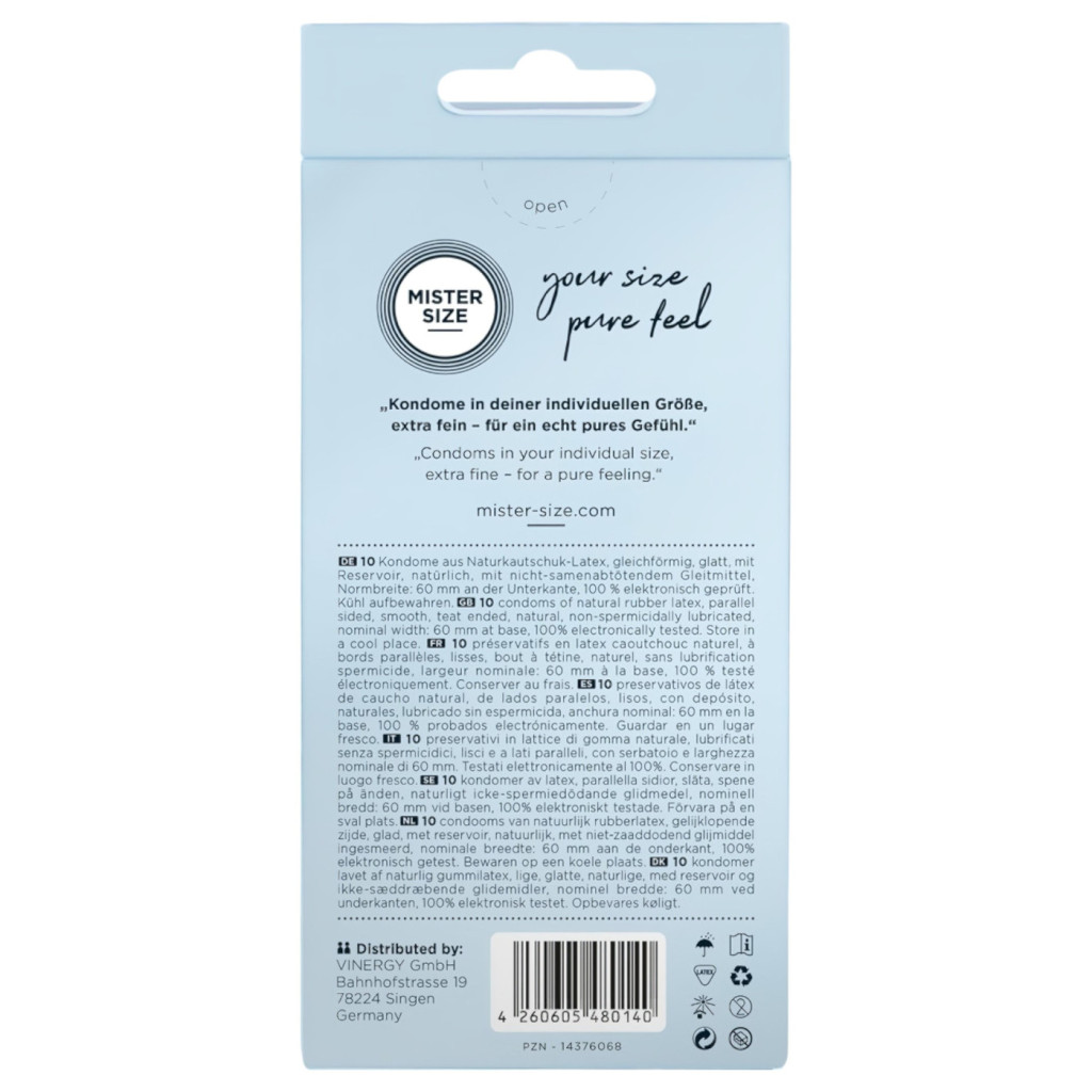 A Mister Size óvszerek különlegessége az ultra vékony falvastagságban rejlik, amely lehetővé teszi, hogy minden érintést intenzíven Érezdn, mintha semmit sem viselne. A 60 mm-es névleges szélesség gondoskodik arról, hogy az óvszer ne szorítson, így az együttlét minden pillanata az élvezetről szólhat, nem pedig a zavaró tényezőkről.