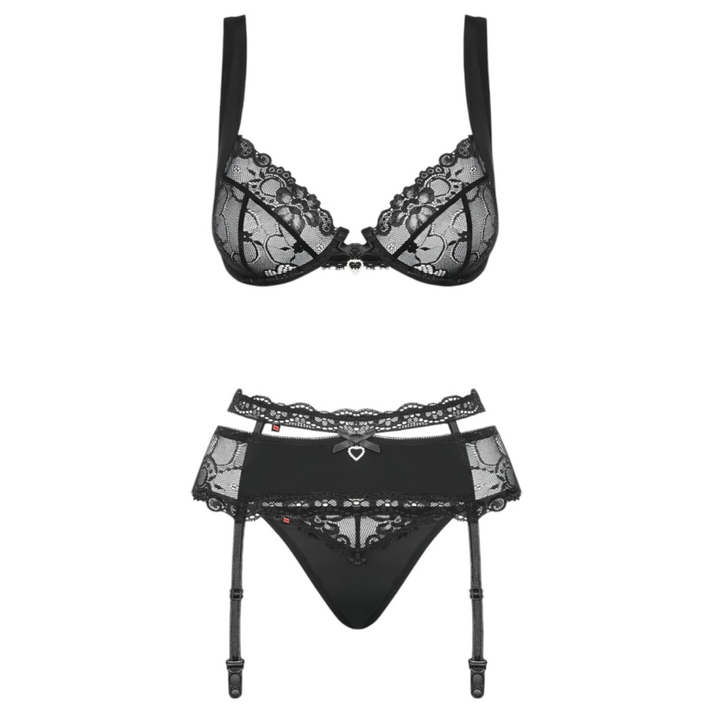 Készülj fel egy felejthetetlen estére az Obsessive Heartina fekete fehérnemű szettel! Ez a darab nem csupán egy fehérnemű, hanem az önbizalom és a csábítás eszköze. A mélyfekete szín és a finom, virágmintás csipke kombinációja egyszerre kölcsönöz elegáns és provokatív megjelenést viselőjének.