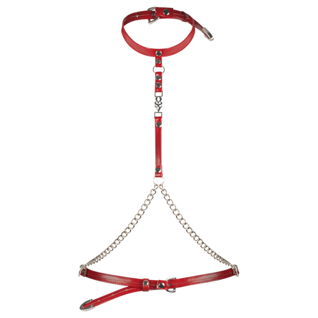 A hám kiváló minőségű, puha bőr hatású anyagból készült, amely lágyan simul a testre, miközben a fényes fémláncok és gyűrűk izgalmas kontrasztot alkotnak. Az élénkpiros szín azonnal magára vonzza a tekintetet, és tüzes hangulatot varázsol a hálószobába.