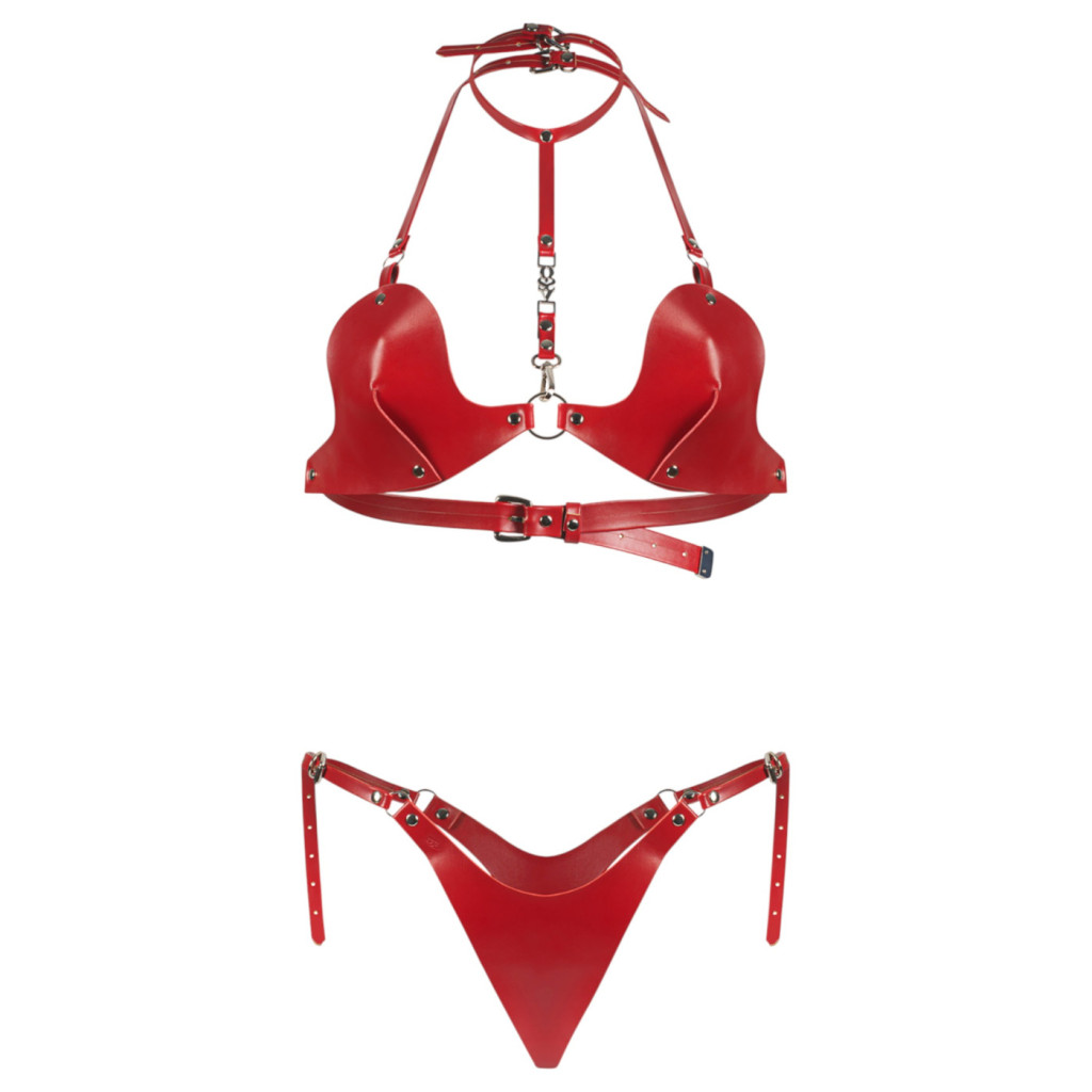 A szett egy különleges kialakítású melltartóból és egy hozzá illő, merész tangából áll. A melltartó pántos megoldásai és a fém díszítőelemek kiemelik a dekoltázst, míg a rugalmas, fényes anyag tökéletesen követi a test vonalait, biztosítva a kényelmet és a csábító megjelenést egyszerre. Legyen szó egy különleges alkalomról vagy a hálószobai önbizalom növeléséről, az Inferro szett a szenvedély szimbóluma.