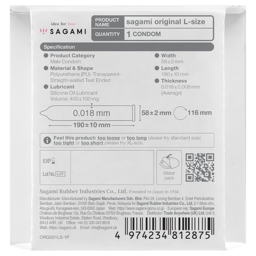 Az "L" jelzésű változat 58 mm-es szélességével kifejezetten azok számára készült, akiknek a standard méretű óvszerek kényelmetlenek vagy szűkek. A Sagami Original nem gumiból (latex), hanem speciális poliuretánból készül, így kiváló választás latexérzékenyek számára is.