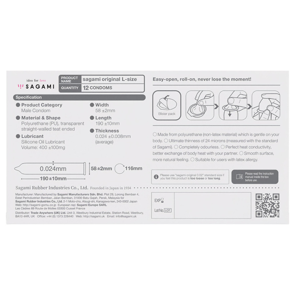 Fedezd fel a védekezés új dimenzióját a világ egyik legvékonyabb óvszerével! A Sagami Original 0,02 L nem egy hagyományos gumióvszer: a japán technológia csúcsát képviselő poliuretánból készül, amely lehetővé teszi a mindössze 0,02 mm-es falvastagságot. Ez a vastagság egy hajszál vékonyágával vetekszik, így biztosítva a zavartalan, bőrközeli élményt.