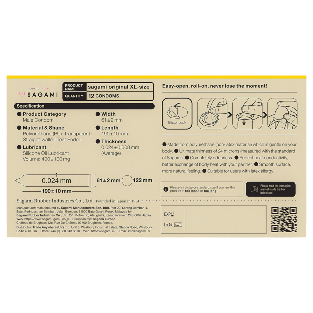 A Sagami Original 0,02 XL a japán technológia csúcsa, amely azoknak készült, akik nem akarnak kompromisszumot kötni a biztonság és a természetes élvezet között. Ez az óvszer mindössze 0,02 mm vastagságú, ami szinte észrevehetetlen viseletet biztosít, miközben az XL-es méret (61 mm-es bőség) garantálja a kényelmes és feszülésmentes illeszkedést a nagyobb méretekkel rendelkezők számára is.