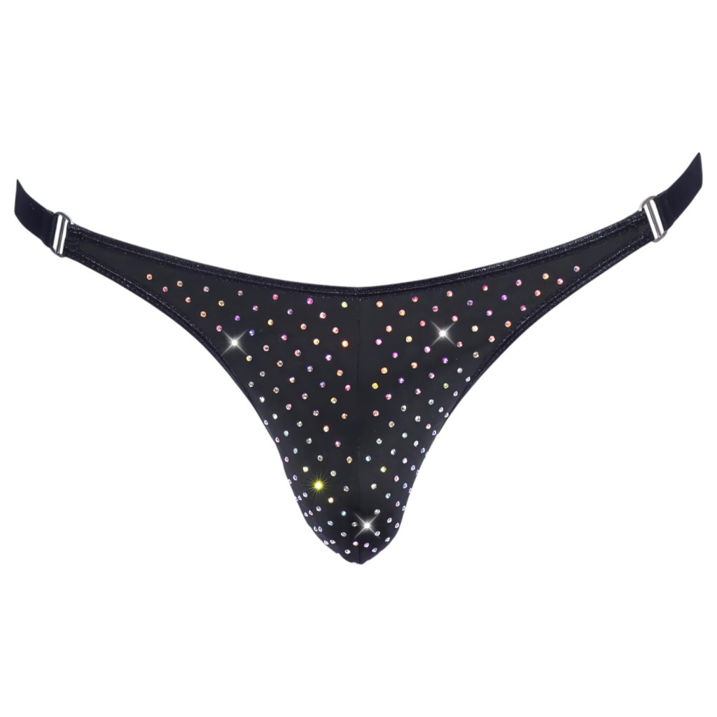 A mélyfekete, selymes tapintású alapanyag és a rajta elhelyezett csillogó strasszkövek tökéletes kontrasztot alkotnak, így garantáltan minden tekintetet magadra vonzol. A tanga fazonja nemcsak esztétikus, hanem úgy lett kialakítva, hogy kiEmeld a férfias idomokat, miközben diszkrét és provokatív marad.
