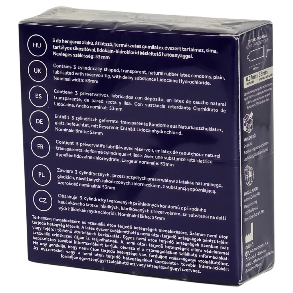 Az óvszer belső felületén található speciális, késleltető hatású anyag segít a korai beteljesülés megelőzésében, így te és partnere is hosszabb ideig élvezhetik az intim együttlétet. A prémium minőségű alapanyagok és a szigorú gyártási technológia garantálja, hogy a védekezés ne csak hatékony, de kényelmes is legyen.