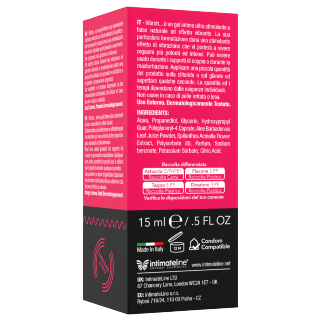 Fedezd fel az érzékiség új szintjét a Vibroh folyékony vibrátorral! Ez a különleges, 15 ml-es kiszerelésű gél kifejezetten az intim területek stimulálására lett kifejlesztve, hogy minden érintést felejthetetlenné Teddn. Legyen szó egyedüli felfedezésről vagy közös előjátékról, a Vibroh garantáltan fokozd az izgalmakat.