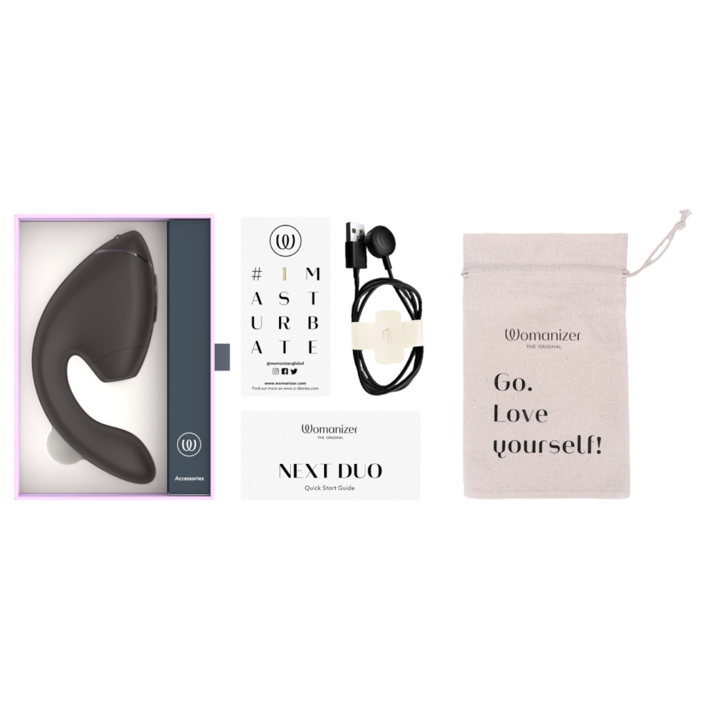 Fedezd fel a gyönyör legmagasabb szintjét a Womanizer Next Duo készülékkel, amely a márka eddigi legfejlettebb 2 az 1-ben stimulátora. Ez az elegáns, mélyfekete eszköz mesteri módon ötvözi a világhírű, érintésmentes Pleasure Air™ technológiát az intenzív, belső G-pont vibrációval, hogy egyszerre kényeztesse minden érzékszervét.