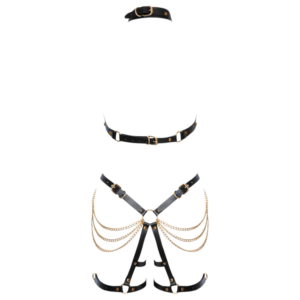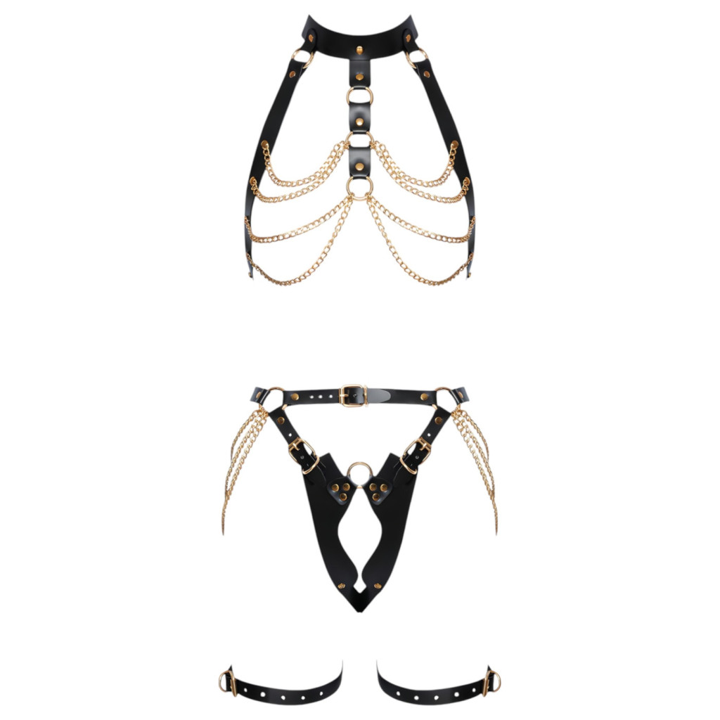 A szett minden eleme kiváló minőségű, tartós bőrből készült, amely nemcsak látványos, hanem kényelmes viseletet is biztosít a bőrrel érintkezve. A gondosan megmunkált pántok és az aranyozott csatok kiemelik a test vonalait, miközben professzionális megjelenést kölcsönöznek viselőjének.
